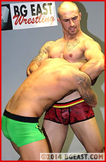 The third and final fall finds the wrestlers all warmed up for a fight to the finish, with hardly a trace of the friendly, easygoing tussle we started with. After the third fall, though, these dudes are still raring to tear into each other, leading to a decisive finisher, a clean, mean sleeper, the kind BG East has built its worldwide reputation on! A terrific debut by two stunning and very sexy hot lookers with lots of muscle and know-how!