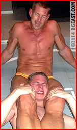 Billy was never, ever going to have a chance of defeating Mitch in a fair fight, but then, Billy has never, ever fought a fair fight. A headbutt to Mitch's balls brings the towering muscle stud's momentum to a crashing halt. "No, that's what I came here for!" Billy spits as he climbs on top of the writhing stud, slapping his handsome face and relentlessly pounding those juicy pecs. Suddenly he snaps his lean thighs around Mitch's head in an airtight face-to-crotch headscissors, grinding his balls against his opponent's gasping mouth. "Is that what you wanted? Is that why you invited me over?" Billy taunts.
