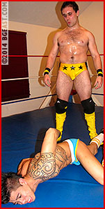 But tights and yes even those pro trunks are ripped off both battlers' beautiful bodies as the war to hold onto their dignity rages to a fever pitch. Both wrestlers lose their boots and about a gallon of sweat. Gear is used as a weapon, as a means of humiliation, and as a way to show the seductive power of these two hot bodies in nearly every version of raw male erotic wear: tights, boots, trunks, underwear, thongs, jockstraps, socks... But just one proud hunk manages to walk out of the ring with his gear in tow, his dignity intact, and bragging rights firmly in hand, proving definitively who reigns supreme in the BG East ring: trunks or tights!
