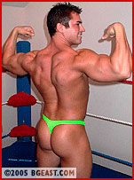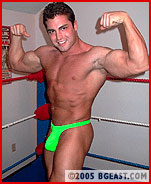 ...Oh wait--did we forget to mention that our delivery boy was Jimmy Gee, a hunk who wrestled once for us and, like many bodybuilders who assume having muscle is all the training one needs to wrestle, promptly took a big beating and never sought a second match? Of course, the guy who thumped him was taller, bigger and a hell of a lot meaner, and even in his tight uniform, we could see that Jimmy was bigger than ever. "You ready for this?" Jimmy boasted, flexing his big arms, surely expecting Mike to take up his poseoff challenge. No dice! A clothesline puts the delivery man down! A slick roll up pin is minor offense indeed: Mike pops free and levels him with a sternum-buckling elbow, then marches the overwhelmed hunk around by his pecs, into and up the turnbuckles for a powerslam, before reapplying the claw, refusing to break even when Jimmy begged. Stripped nearly naked, trampled, choked, bearhugged, crabbed and bodyslammed over and over to the breaking point: "No more. Please stop." How merciless is Mike? Jimmy submits and submits, and Mike, neither smiling nor sneering, simply keeps torturing him. And that's 3 submissions before a knock out! Barely breaking a sweat, Mike returns to his workout, cranking out one-armed pushups as the destroyed hunk lies prostrate in the foreground.