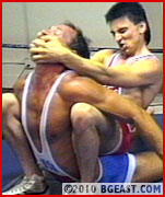 And speaking of gear, his second accomplice is Tommy Lopez who wears the skimpiest red bikini imaginable, detailing a major bulge. it does not escape our - or Kid Leopard's - attention! And Leopard chooses holds which point it up even further, stretching Tommy with a series of boston crab variations until you think his poor Tommy's back is about to snap. Clearly the full boston is a hold close to the Leopard's.... heart. He clearly relishes applying it on cute Tommy. It's quite literally a textbook application of seriously sexy submission hold. The Professor advises on the exact placement of weight for maximum application of torque as well as proper control of the ankles and spreading of the legs.