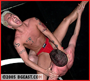 With the shorts off, out comes the wild side of these boys...who clearly have on thing on their minds! Rocco continues to manhandle poor Jeremy, but now with even more humiliating holds. Jeremy is pushed to the brink of submission over and over in with crotch-smothering headscissors, bulge-grinding full nelsons, and back-breaking camel clutches. You can tell Rocco clearly wants to dominate the beaten Jeremy, as both the bulge in his briefs and his ego continue to grow at about the same rate. With his head too swollen to notice (in more ways than one), Jeremy is able to score a reversal of his own....treating Rocco to his own special variety of scissorholds combined with some much-needed bulge work!!! Both Rocco?s ego and his cock won?t stand for too much more....and then the real punishment begins. Stripping down to some oh-so-skimpy jocks, the beautiful bubble butt of Jeremy?s proves to be the prime target of Rocco, as he utilizes any hold possible to grind his large jock-clad basket into Jeremy?s exposed ass. This clearly is music to Jeremy?s ears, as his bulge in his bright yellow jock becomes more than noticeable....crescendoing into an intensely loud and physical round of sexual holds and oiled body worshiping...and ending with both studs completely drained!