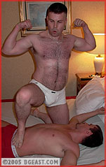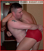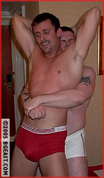 Fantasy fulfilled, Graham exults in the heady aura of his victory submission and then goes for broke by applying a second head scissors with the big lad's face buried even more snugly in the crotch of his jeans. And to add insult to injury, he strips the big boy down to his tighty whities! Brawlerboy down 2-0! He strikes back. What starts out as playful nipple tweaking and face-slapping progessively gets more serious as Brawler uses his size, strength and experience advantage to dominate his hot rookie stud. He easily lifts and carries the handsome newbie, nelsons him into submission and schoolboys him for frosting. But Graham does not give willingly or easily. So Brawler resorts to his 'old faithful': one of the most effective bearhugs in BG. He breaks his rookie down slowly and methodically through several applications of his hot hug, showing off the rookie's beautiful butt. Not content with equalizing the submissions, our big n beefy Brit applies it again - but not before humiliating the rookie in a long-held schoolboy. And then to accentuate his point he applies a reverse bearhug as well! BEARHUG HEAVEN! Graham slowly goes limp in the big boy's arms and finally gets dumped onto a bed. Brawler peels his trunks, exposes, worships and humps Graham's beautiful butt. But our hungry rookie isn't done yet either, working over the victor's hard tool....