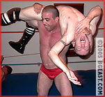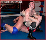 Anthony proves himself to be quite the strategic wrestler, ordering Jonny to keep working on the grunting hunk?s neck and wear the big man down until Marco is forced to cry out in submission. But the big warrior is not going down without a fight. Marco overpowers the both of them trapping Jonny in a screaming Boston crab and then repeatedly scooping and slamming the lightweight pros. But the boys throw out the rule book and it?s game-over for our hunky chunk of beef. As strong as the titan is, it's tough to stave off a 2-on-1 barrage of technically refined abuse. And when he does fight back, the diminutive punks cheap shot him and spread eagle his legs to their great amusement! The grunt manages a few minor comebacks, but his massive strength is waning and there is only so much glorious ab and pec abuse he can take before tapping out. For those who like to see big muscle gods chopped down to size, this is a classic BGE myth in the making.