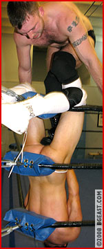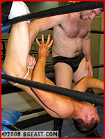 Whether cheating chokes or clawing at Reese's pretty face, Jonny fights dirty. A back-arching suspended bodyscissors makes Reese's heavy-hanging, hard-on bulging basket a lewd target Jonny can't resist grabbing, but Reese won't submit! "What the fuck is wrong with this kid!" Jonny marvels, digging deeper into his bag of tricks. But when Reese stuns the burgeoning badass with a swinging DDT from the top rope out of nowhere, the only thing more shocking than his pride-salvaging pin is Jonny's retaliation. Stripped naked, quivering and virtually KO'ed, Reese still refuses to don the disturbingly skimpy thong Jonny shoves in his face. But two big bodyslams change his mind. And a bullseye emblazoned over his big basket makes for a unmissable target that bucks and bounces. Grinding knees, grabs, gropes and claws, crotched on the ropes again and again, kneed in the nuts, the bulging target slapped, spanked, jabbed, flicked: Jonny sinks deeper into the depths of bulge-bashing depravity than ever before!