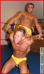 Rocked, Aryx challenges the rookie to a Gut Bash battle! The two exchange brutal punches, each one more vicious and powerful than the one before -- but neither man is willing to submit to the other! Back and forth the punches fly until Eddy is a slightly staggered, giving Aryx just the opening he needs! A reverse face in the armpit headlock forces Eddy back into the corner -- and Aryx is nothing if not a master of corner punishment, as Eddy is about to discover! Punches, shoulder blocks, and a few stomps for good measure, and Eddy is down! Aryx drags him to his feet, and drops him into a brutal belly buster over his knee, following that up with a ripping abdominal claw! Eddy finally, reluctantly surrenders to the brutal ab abuse -- but Aryx gives him no respite, turning instead to target another point of Eddy's pride by clamping on a double clawhold on those pretty pecs! but Eddy's pecs are more than a point of pride. Besides being sensitive, they symbolize his manhood. Eddy fights back and escapes and it's payback time! Back and forth the pec claw war rages, until Eddy gets Aryx in a vicious knee-to-the-back standing surfboard that has the punk-stud screaming in submission! Could this get any hotter?
