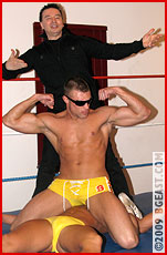 Oh yes it could! For Eddy's triumph is short-lived. Aryx targets and then takes out that offending knee, and now it's time for payback, Quinn-style. Brutal leg torture, over and over again, until Eddy is practically limp and lame! The Quinnlock guarantees the finish! As Aryx grabs the sunglasses as a trophy, and flexes in triumph -- the bell rings. It's The Boss!, applauding and calling out congratulations! Aryx bristles with pride as The Boss climbs into the ring all smiles. "Look at you," The Boss continues to smile, "You look great, new nipple rings, and that tan!" The smile fades as The Boss grabs Aryx's balls. Seems our Aryx did something to raise The Boss' ire! Aryx's eyes fill with terror. The Boss shouts a command to Eddy in perfect Portuguese! Eddy secures Aryx's arms...