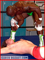 And a direct knock to the nads brings the big bodybuilder down hard! Bobby recollects himself and refocuses his attack. A devastating flying bulldog headlock plants Tyrell flat on his face and places the momentum squarely back in Bobby's hands. It's a devastating move and one which very often finishes off even the biggest and baddest contender for an easy 1-2-3, or even an 8-9-10! Bobby has perfected the move and calls it his own. With Tyrell stunned and now barely conscious, Bobby's tutorial kicks into high gear.