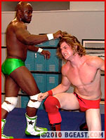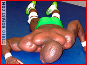 Another reversal, and Tyrell is spitting mad. He lifts and slams Bobby over and over to the mat, physically dominating him with overwhelming power and a ferocity to defend his injured pride. The battle continues to teeter back and forth between Tyrell's muscle-packed ferocity and Bobby's quickness and impressive arsenal of moves and holds, until one man is sweat-soaked and sleepered in the center of the ring. Having decisively schooled his opponent in what wrestling is all about, the victor flexes for the camera. "You'll NEVER be half the wrestler I am!" he screams down at the unconscious loser. The crazed look in his eyes suggests that this fiercely fought battle of wills and skills may just have left him a little unhinged and hungry to teach other BGE hopefuls what 'it's' all about. We hope so!