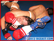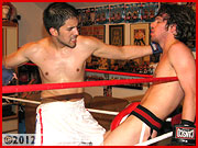 Repeatedly Ethan pounds Lorenzo to the mat, and repeatedly Lorenzo gamely climbs back up to his feet, shakes loose the cobwebs, and fires back. In an apparent replay of the debacle in the motel room, Ethan mercilessly pummels Lorenzo, unwilling even to wipe the sneer off his face as he does so. Any pretense of principled sport vanishes as tempers and egos flare. Ethan backs Lorenzo to the corner and bludgeons him with punishing gut punches. Then, in a moment of towering audacity, Ethan opens his arms and offers his opponent a free shot at his crotch. Sure! how generous: A thick hard cup (of which Lorenzo is at first unaware) minimizes the blow's impact. But then Lorenzo discovers the ruse, and tired of being on the receiving end, he delivers a surprise bitter upper cut that sends Ethan reeling to the ropes, where he hangs on the ropes like Dad's old shirt on the clothesline while Lorenzo intently exacts some much-deserved low-blow revenge!