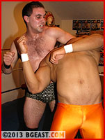 In a climactic finish (and we mean "climactic" in every sense), The Mastodon gives Marc two options: He can choose to be knocked out in a rear naked choke (and we do mean "naked") or to jerk himself off while clamped between the Mastodon's thick, hairy thighs. It's hardly a choice at all, as Morgan holds all the chips (and all the spandex, too). But did we really just say "finish"? Because it's hard to believe that Morgan "The Mastodon" Cruise can ever get enough of humiliating and battering such a beautiful humpy sex object as Marc "Muscles" Merino. Who can blame him? Would YOU pass up such an opportunity?