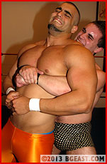 Morgan becomes more and more incensed by the muscle god's incandescent orange tights, like a bull enraged by shades of red. We happen to like Marc's taste in flamboyant gear, but given Morgan's hot temper, it's best not to get too attached to it. He strips the tights off Marc's muscular legs, revealing a black-and-blue thong underneath (but don't get too attached to it either!) and the melon perfection of his firm tanned butt cheeks. When the long-suffering Marc finally does tap out, Morgan Cruise shows no interest in bringing his wicked games to an end. Having already stripped Marc down to his suntan, he forces Marc to remove HIS trunks as well, to reveal a simple, "real man's" jockstrap.
