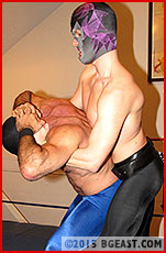 Mind-Lock is not one to rely solely on his unrivaled mind. He enjoys using his own deliciously evil muscles to visit pain and suffering: keeping The Azure Flame immobilized, he ever so slowly begins to lock on a figure 4 leg lock. Paralyzed, The Azure Flame knows what pain awaits him, yet there is nothing he can do to prevent it! Finally, Mind-Lock pauses no more, and The Azure Flame feels the agony in his legs doubled, for Mind-Lock is using his power to amplify the pain receptors for both of his captivated prey!