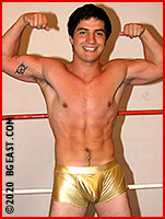Jake Jenkins did not get the memo on Braden's recent reinvention. Jake dives into the ring, wearing sensationally shiny and tight golden trunks and does a quick, jogging lap around the posing muscle man in the middle. "Looks like we've got a big guy over here," Jake chuckles, tauntingly poking the bodybuilder in the back and hopping away. "Are you too slow to keep up," he asks rhetorically, bouncing on the balls of his bare feet. While Jake is one of the smaller studs in the stable, pound for pound, he is also one of the most dangerous. His extensive amateur wrestling and MMA background have enabled him to own the mats against much bigger opponents. He sees the mass of luxurious muscle on Braden and can't help but cluck with confidence, knowing just how to exploit a gym bunny so heavily laden with aesthetic, though not always functional brawn.