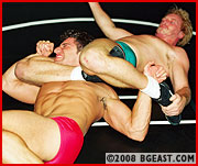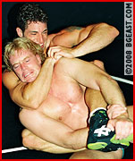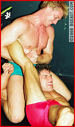 Brad shot to the top of our pantheon of wrestlegods with stunning mat mastery, impressive ring skills, and a physique that won't quit! We offered the chance to prove himself in a submission shoot-fight, no holds barred, against a pro who has been studying jiu jitsu. This matroom 'ultimate-fight' starts out friendly enough: wearing tigers and tight-fitting squarecuts, they go for armbars, chokes, triangles, ankle and key locks, tapping the mat or oppo 3 times to signal submission. Muscles bulge and sweat pours as they go from guard to mount positions: submissions, chokes, scissors, neck cranks. Between falls we study Brad's phenom bod and butt all pumped for action! The long and sexy musclebattle ends up getting very nasty. Scissors - straight-on and figure 4, chokes, sleepers, low-blows. With no referee, nothing is sacred! With a startling near-KO finish! Wow! This is wrestling! A hard-fought, all-out, no-holds-barred multiple submission mat-brawl!!!!