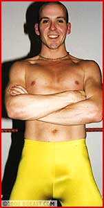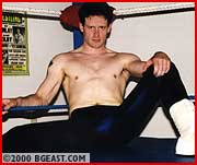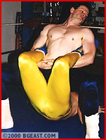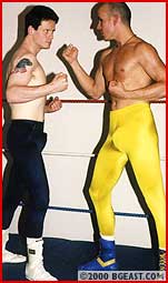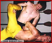 The pro wrestling look was never hotter than this - two guys in ring jackets and long shiny spandex tights with huge hard-ons throughout. Newcomer Jonnie wears bright yellow showing every detail of his big rod and pretty butt. Rookie Jarret's tights are navy blue and how he stands out in profile! The heel in Jarret emerges almost immediately so hot'n'horny is he to get his punishing hands on the sexy Larue. The new boy is subjected to a big battering effectively making a toyboy jobber for Jarret. Jonnie gets head-scissored, backbreakered and body slammed, with and without his tights on. Things get so hot that even the thin sweaty spandex is too much clothing for these guys. Jarret strips Jonnie clean, then forces the job-boy to peel his tights down and "pay the piper". Alternately brutal and sensually erotic to doubly climactic explosions at the end. Total Hard-on Heaven!!