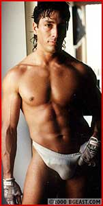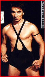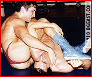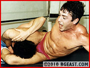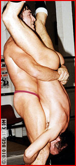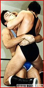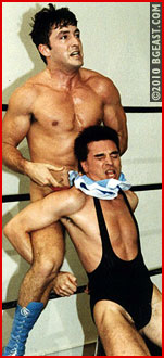 Beautiful Brian is bigger, taller and more muscular than KL but size-differential has never stopped the Leopard. And while KL goes for the jugular right from the start, Brian is not intimidated. He's the first to go for the groin which does not go over very well with Leopard. Brian's skintight singlet get stripped, tied around his ankles and his muscular bare butt gets a spanking. But Brian is ballsy and KL finds that singlet wrapped aound his neck! And the bigger guy tosses the lightweight around the ring and strips him of his singlet as well. An upside-down bearhug has Leopard begging and pinned under the boot of a victory-posing BB. But Brian's not finished. He shakes up the Kid with a great classic bearhug as well. All this punishment has KL seething and it's not long until Brian's beautiful body is battered and beaten and racked across his smaller opponent's shoulders. A great pro ring catchweight classic!