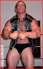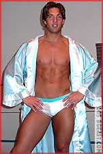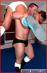 Justin's never looked more stunning or focused, shadowboxing as his robe slips open sexily, doing crunches with his ample package filling the frame, flashing that transfixing, white-toothed smile at his fans thru the camera while he stretches. Muscle monster Mazetti's never looked more intimidating, clad in black boots and leather, indulgently flaunting and flexing his rockhard bod. "You're big, but I've beaten bigger," Justin warns, and bolsters his cred by bouncing the bull with two drop toeholds and snapmares. But an unexpected uppercut makes the male model gasp, "Oh shit," opening him up for forearms to the chest and a rough drag around the ring courtesy of a double-handed vise grip on his big nippled pecs. Sensing yet another easy, dominating win, Mazetti charges, only to eat boot when Justin gets a leg up. And after a wild, wind-up bodyblow drops him to the mat breathing hard for the first time in years, it's Mazetti manufacturing a pause in a desperate attempt to break Justin's momentum: "I'll make you a deal: you give me your best gutshot, and I'll give you mine" Mazetti propositions. "I won't even defend myself." With the big man already nursing his abs, it's too tempting an offer to refuse...