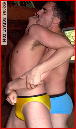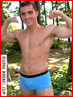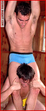 BGEast often uses the Wrestleshack as a proving ground for new talent - what better way to determine if a young wrestler has what it takes to be a star than to throw him and another stud into the Shack under the condition that the winner is the one who walks out? There is something about the Shack that brings out the animal in men; limits are tested and pushed; and sometimes raw determination and will-to-win overcome skill and size - because it doesn't matter who gets the most submissions. All that matters is who walks out with his head held high into the bright sun of day. Sandro and CJ Parker are both young studs with nascent skills and an equal determination to make it in the world of BGEast, so what better way to see who is the better man than to step into the Wrestleshack, let the cameras roll, and see what happens? Sweet-faced CJ is obviously at a disadvantage to the naked eye to begin with; he is giving up size and weight to the very muscular Sandro. Sandro-of-the-perfect-butt also seems to have the necessary focus to be a champion - he merely grunts and stares when CJ asks with a friendly smile, "Are you ready for this?" And sure enough, that friendly smile is wiped right off CJ's face in a matter of seconds as Sandro immediately uses his size advantage to start wiping the mats with CJ. And just when we're starting to wonder if CJ stands for 'cute jobber', CJ adjusts his own attitude, and turns the tables on Sandro - getting on top of him and clamping a brutal pec claw on those oh-so-perfectly round pecs Sandro is so obviously proud of! The forest is soon echoing with Sandro's screams of pain. It's not gonna be as easy as the muscle man thought!