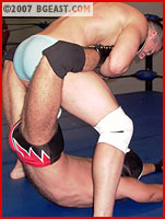 But tag team success comes from teamwork; and after the opening bell it's obvious the masked bruisers are more experienced than their muscular foes. Quick tags and demolition in their corner, a couple of brutal blows drop Alexi to the mat, but now all the muscle Alexi has added comes in handy! He slams Cage to the mat! He wants to humiliate the masked man the way he's been humiliated, over and over again. What follows is a display of spine-snapping back destruction that even made the jaded Boss wince! Alexi even lets Drew have some of the fun for a while. Finally, the sexy Russian stud tires of the cat-and-mouse game and ensnares his weakened foe in a brutal swinging pendulum. After Cage screams out his humiliating submission and tried to crawl to his corner, Alexi sneers: "That's a good look for you, on all fours," as Max helps his battered partner back to their corner.