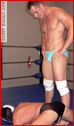 Lots of kids dream of wrestling stardom - Alexi was no exception. When he got his big break with BGE, he was sure stardom would follow, but his win record has been just plain tragic. No matter how hard he trains, no matter how big he gets, he always seems to come out on the losing end. Someone must be to blame! "You always set me up," he accuses The Boss (as if The Boss would do such a thing!), "and you're not doing it to me again!" So, when asked to take on newcomer Cage Thunder, Alexi insisted that it be a tag team. "I want someone to have my back!" Always happy to accommodate, the boss set Alexi up with newcomer Drew Russell, a sexy tall hairy chested muscle man eager to make a name at BGE himself. And Cage Thunder, a masked man from the swamps of Louisiana, was more than happy to sign on his soul brother, Maxx Thunder. "Not that I need a partner to beat pretty boy ass," he boasted. "I may never tag out! Pretty boys can't wrestle. Alexi's proved that over and over. Hell, my mother could kick his ass."