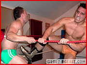 'This is just a warm up before my REAL workout,' Exavier boasts as he climbs through the ring ropes. 'Who are you, anyway?' The Irish stud replies: 'Devil Devitt, who are you?' his hunky opponent seems genuinely unimpressed. Exavier answers by flexing his muscles. As always, Exavier is confident and cocky. Since coming to BGEast, his record isn't as impressive as his arrogance might pretend'two losses (to The Marauder and Cybertron in the MASKED MAYHEM series) and a couple of wins over opponents he outweighed by many pounds. Despite his feigned ignorance, he is VERY aware who his opponent is. Exavier knows that Devitt's BGEast debut was a very close contest with Jonny Firestorm'one of those overmatched opponents Exavier made mincemeat out of'and so he figures, 'hey, if this irish punk couldn't easily demolish that little Firestorm runt, what possible chance does he have against me?!'