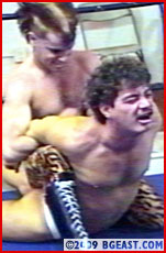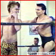 You have to give cute babyface fan favorite Tommy Lopez and veteran matboy John Borsos kudos for bravery above and beyond the call of BG duty for agreeing to step into the ring with these two unpredictable wildcats. BG coaxed (coaxed = bribed = $$$) his two top heels to retract their claws and rivalry long enough to sign for a one-time partnership for this special tag match. Or maybe it was that boner provoking photo of sexy Tommy and John in their bulging white trunks which BG dangled within reach of the heels claws that inspired them to scratch their claws on the dotted line!