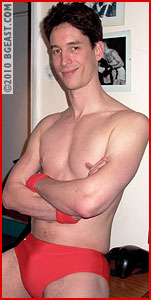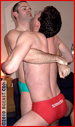 And how Garrison loves to torture Menard's balls! Let us, to travesty the Victorian poetess Elizabeth Barrett Browning, count the ways. One, he grabs them with his hands and wrings them. Two, he digs his heels into them, making the pretty-faced fighter moan. And, three, when he's got his man's legs stretched out, he cannot resist ramming his knee up to the vulnerable bulges outlined on Jean Luc's skin-tight red Speedo. Ty maximizes skin on skin contact, squeezing up against his tall, lean opponent, chest to chest, stomach to stomach, crotch to crotch, and reaching round to cross-face chicken-wing his arm up high and tight against the shoulder blades. Here is a guy who fully understands and thoroughly explores and enjoys the intimacies of hard, horny hand-to-hand contact.