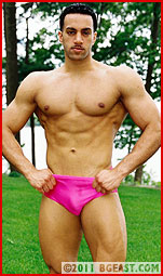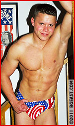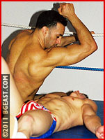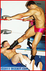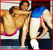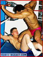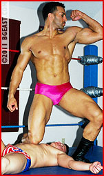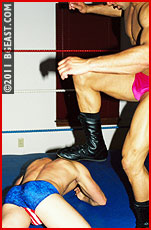 Incredibly cute in his All-American flag-style speedo and white boots, Kieran takes a blazing beating: hoisted up into a one-shoulder backbreaker, crushed in a massive bearhug, nailed with one brutal finisher after another then covered for the 1...2.... Uh, no! Blaze does not allow the 3rd count! DDT's and false pins keep the pretty boy dazed and confuzed. The kid shoots off a fierce dropkickand even confounds the big guy with a flying head scissors but it's too little, too late. Watch his abs contract as Blaze presses his knee on Kieran's chest, then watch Blaze's abs do the same. Woof! Prolonged punishment on the young pretty boy. And in sexy pink trunks, Blaze is heel arrogant and pretty pro perfect himself.