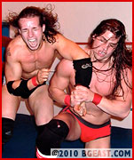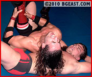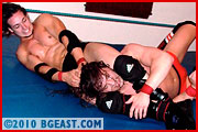 Even if you never saw his previous match, it takes only a couple of seconds to peg handsome Bullet Bernard as the sneering, self-adoring heel he is. Bernard has got glowering down to an art form and brings to the ring the pouty intensity of a 1970s method actor, totally immersed in character. He's got the brooding dark good looks and the "lean and hungry" look of a classic Shakespearean scoundrel, with the samurai ponytail, chin patch, and Gothic cross tattoo as seals to his bad-ass-ness. He's also got a body that's beautifully proportionate and sexy as hell! In the ring, his eyes shift like a predator in search of prey or, when the going gets tough, a quick and easy getaway.