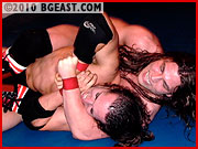 Bobby squeezes a body scissors on Bullet and works hard to secure a choke hold on the long hair