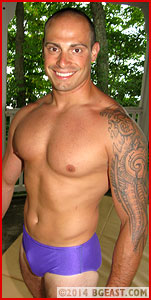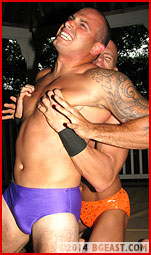 The BG East gazebo poses some unique challenges and opportunities to wrestlers. The venue would seem to clearly favor mat wrestling specialists like Denny Cartier, with its absence of ropes, turnbuckles, and springs that make professional wrestling in a ring such a different and distinctive genre. In the gazebo, there are no ropes to bounce off of, and when someone gets slammed to the mat, the wooden floor underneath is remarkably unforgiving. Denny thrives in settings like this, where his amateur wrestling skills, incredible flexibility, and blistering speed make the most of the simple, straightforward context of the gazebo. With his hotly muscled ass poured into tight purple trunks, Denny looks understandably confident and completely at home as he stretches and practices before his opponent arrives.