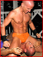 You can tell that Lon is nervous because he doesn't say a word as the two lock-up, pressing, and pulling, and feeling out each other's powerful bodies. Never, ever, at a loss for words, Lon's notoriously running commentary of cocky swagger and withering trash talk is silenced by the unfamiliar setting. Then again, his sudden knee to Denny's gut and forearm blow to the young stud's muscled back speak for themselves. Obviously, Lon is determined to translate pro strikes and a balls-out brutality from the ring to the gazebo!