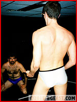 The third and decisive fall is, quite literally, balls out wrestling intensity as Will stretches Patrick out beyond the ability of his tight white trunks to contain him. The balance of power teeters back and forth as they battle to the wire, until skull crushing headscissors milk the last ounce of resistance out of one furiously bruised wrestler. There's always time left for one last humiliating schoolboy pin, humbling smacks to the face, and only one hot and cocky hunk left slapping down the victorious trash talk. MEN doing what they do best!