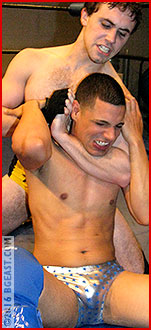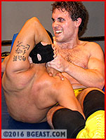 Desperate for relief, Alex thrusts his fist to Morgan's balls. The Mastodon bends in two, clutching his crotch. Alex attempts to capitalize on the low blow, but Morgan, now in a full blind rage, retaliates with a body slam, then limps to the corner in mincing steps. "Didn't think you had it in you to do something like that," Cruise speaks through clenched teeth, though with a measure of newfound respect for his opponent. Retribution takes the form of a cross armbar, with Alex's lips to the mat and his elbow high up between Cruise's massive hairy thighs. Quick-thinking Alex turns Morgan's roll into a bodyscissors and uses his arms to spread the heel's legs wide, giving the vulnerable animal's sore nuts a jostle and a poke. Morgan is gasping in pain.