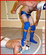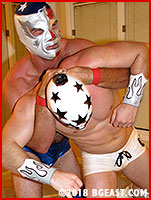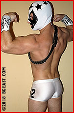 Dr. Magnificent presses his luck too far, though, taking advantage of Silver Eagle's defenseless condition to try to unmask him. Eagle lashes back at this cowardly aggression with forearm smashes to the villain's smooth, sculpted chest, beating him almost senseless. Still feeling the after-effects of his recent pummeling, Eagle takes a moment to recoup and strike a pose for the sake of the fans watching at home. He pays for turning his back to a rattlesnake like Magnificent, who attacks from behind, resuming his sadistic assaults. Late in the match, too late perhaps, Silver Eagle decides to fight fire with fire, forearm-slamming Magnificent in the nuts. Our hero decides you can't play fair and square with a rat like the Doctor, and he delivers a full serving of bone-crunching comeuppance, determined to unmask and thus expose the villain for who he really is. The last eight minutes of this contest consists of the finest mask-versus-mask fray ever caught on screen, with a tightly knit climax that will grab true-blue BGE fans by the balls!