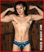 Old school meets new school, when Jason and Ash step into the wrestleshack to put their gut-punching reputations on the line. Ash looks stunning in a baby blue and black mesh singlet. He is in the middle of a set of leg lifts when Jason arrives, showing off nearly every square inch of his magnificently toned physique, wearing only very brief multicolor trunks. "You've really got to do yoga," Jason offers his unsolicited advice. "I haven't done a crunch in a year and a half, and look at me." The yoga master strokes his perfectly flat, fit abdominals and stretches out on the mat to hold an effortless plank pose.
