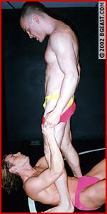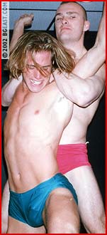Punk-hunk Kurt is hot for prettyboy Trevor, who, in black leather and jeans, is full of attitude. But Kurt knows how to be cocky too. They start in square-cuts but soon get stripped to skimpier bikinis showing off big bulges and hot butts. It's one of the most beautiful displays of wrestling bodies ever to grace a Matmen tape. And with Kurt crotch-ripping, hair-pulling, bear-hugging and punishing the spunky young blond, the resulting images make a near-masterpiece of mat-art. An aggressive, sexy, sweaty mat battle with multiple submissions. Smokin'!