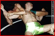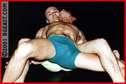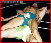 Kurt's in for one hell of a surprise here. Chip Slater, 21, is no pushover. In fact, he's tough as nails. If headscissors do it for you, this is a feast. Some very intense cotch-grabbing - these guys do not hold back. Kurt's big swaggering basket, hanging low and to the side in his square-cut light green trunks makes an inviting target. Several submissions, a surprising ending! Hot and aggressive. A work of wonder for you Kurt Eriksen fans and a fantastic debut by Chip Slater.