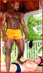 One would think Ace would have learned his lesson after his unforgettable rip-'n-strip, head-to-toe naked, beating-in-bondage and milked-to-climax by the Black Spider debut in Superhero Heels 5: rookies, even 6'1'', 220 pound ones, shouldn't try to bite off more than they can chew. And massive Maxx is more than a mouthful for anyone. Ace tries to slow Maxx's advance with some of the hardest pec punches we've ever seen, but Maxx doesn't flinch. And when Maxx clamps the big Texan in a big bearhug, lifts him off his feet, powerslams him and folds him up in a matchbook press so tight breathing isn't an option, Ace can't submit fast enough! "I see this is going to be a wrestling lesson," Mad Maxx growls as he pulls gasping Ace up by his hair. Ace screams, "What are you trying to do? Kill me?" Face-to-crotch headscissors, bearhugs, and more --before it's over Ace calls Maxx "daddy." Woof!