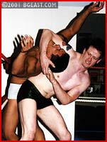 Ricky's warm-up bridge is as sexy as it gets. Rick is totally surprised when Kid Leopard arrives with Jarret. KL's pre-match frisk of the wrestlers is very thorough! Jarret and Ricky are evenly matched, each scoring a submission. Ricky's leg-spread, ab-stretch & face-to-crotch scissors make Jarret groan. Ricky poses over Jarret whose special neckbreaker submisson & bodyslams leave our latino lovely grovelling. Can KL resist punishing the pretty boy? All is well til Jarret fails to apply a figure 4 leglock properly. When he finally gets it, Leopard adds a fig 4 headscissors to Ricky's dilemma. In the end, both newbies are tied in the ropes, their trunks around their knees!