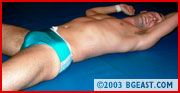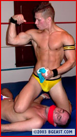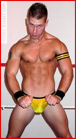 After an interlude where Aryx pumps iron and reflects on the reformation of his tag team (short quote: "Until they perfect cloning, Nick'll have to do."), Aryx heads to the ring to take on "some loser from Europe" who dared challenge him. "I heard about your audition in a London hotel room with Kid Leopard." Before the friendly Brit can answer the humpy American, Aryx drops him with a fist to the gut. Relentless ab abuse--boots in the corner, bare-knuckled blows that leave visible red welts, multiple gut busters--and Danny's wobbling on rubber legs. Aryx drives his dominance in deep with more gut busters, an ab stretch and a flipping, flopping body scissors with Aryx's lean legs flailing down on the Brit's brutalized midsection. There are squash jobs, and then there's this match. When the Brit's on his back, Aryx turns patriotic--stripping his victim bare ass naked and replacing his trunks with an American flag thong. And if that wasn't enough--Aryx breaks out Dan's UK T-shirt to wipe the sweat off his balls before forcing the nearly unconscious jobber to sniff them and cramming them in his mouth--Outrageous!