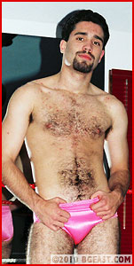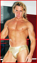 It's starting to look like a classic babyface vs heel match, but will the rule-breaker win this one, or the powerful muscles of the prettyboy blond? As the two begin, the striking difference in muscle size is more than made up for in attitude! Kurt is a swaggering, overconfident heel with hairy chest, goatee, black boots but the shiny golden trunks and tresses of white-booted Brad are in every way a match for this young heel. That's before the match even starts!