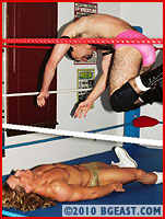 Kurt lays in some major pec and gut punishment. The match goes back and forth with body scissors, leg work and a long, nasty figure 4. Brad's physique is sculptural perfection and prettyboy Kurt has the makings of a great superheel as he works hard to display and destroy this goldenboy hunk. Longhair Brad does his best to put this new BGEast heel in his place, which is pinned or submitted on the mat, fair and square. An intense and exciting battle!