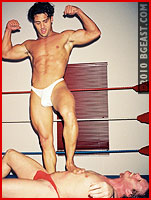 Next, the nasty, extra-gorgeous Puerto Rican studmaster abuses BG East's resident pro Bryan from the moment he enters the ring. Jose is famous for his brand of relentless, badass heeling and his giant package always threatening from beneath stretched trunks. Not to mention his dreaded ab claw.