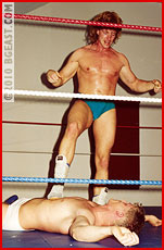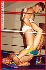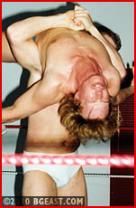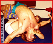 Our big, beautiful blond Vermont farmboy makes his ring debut vs our pro vet. Chris first appeared on the mats in a babyface battle with Flyboy on BG East's Fantasymen 11. Now young Chris gives one of the best debut ring performances ever as the stakes are high, and Bryan is out to show this upstart that he deserves a beating for being a prettyboy high school athlete who thinks he can wrestle. They both bring it, with lots of spectacular action: big moves, low blows, bow & arrow, boston crab, clotheslines, bearhugs, a hot figure-4 head scissors that has Chris bridging high, and a backbreaker which has Bryan begging. He gets his revenge with a hot sleeper, a figure-4 leglock variation that has Chris screaming, ball torture in and out of the ropes, and more. Submissions all over the ring as these two big men fight all out for total triumph. The winner applies a final knockout sleeper! Phew! Hot!!