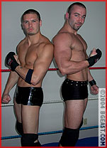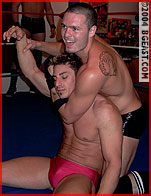 ...And others have tag teaming thrust upon them! We couldn't help wondering what would happen if we put Joshua and Kieran together given their history on MatHunks 1. And when Joshua introduced himself like it was a first meeting, we knew we had something. Kieran balks: "We had a match!" A few reminders, and it clicks for Joshua: "Oh yeah, I kicked your ass!" But when Joshua marvels at ever-growing Kieran's bod, the muscleboy momentarily forgets the insult and joins him in a series of promotional poses. Big John and Daz may be new, but buzz-cut and butch in black, they'd intimidate anyone. Except Joshua: "Just follow my lead kid, and you'll be OK." But that promise turns ominous when Big John chokes him senseless before pulling him into the corner for a gloved fist beating by ultra-aggressive Daz! Dumb 'n dazed from a knock out sleeper and a wake-up headscissors, Josh stumbles into a tag, only for Kieran to run into boots, backbreakers and shoulderblocks from the tagging in-and-out heels.