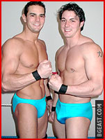 Four of our hottest young heels: The possibilities! But factor in both teams histories--Beau & Shane's near friendship-ending fight on Fantasymen 25, Nick & Aryx's miscommunication on Tag Team Torture 5--and the risk isn't merely between the teams, but within. Shane and Beau watch the tape of Nick vs Aryx's grudge match. In strolls Aryx mid-viewing, and the newbies waste no time sowing the seeds of discord, replaying the evidence of Aryx's sole singles defeat! The match begins: Shane concentrates on buffer than ever Aryx's brawny back. A tag, and Nick works recent Playgirl model Beau's right leg until he submits, much to Shane's vocal dismay. Fall 2, and Aryx takes a beating, Shane cranking a torture rack on the barely conscious blond hunk so long referee Jaxx has to intervene! So much trash talking, between teams, between teammates, all four wrestlers approach their breaking points--until one hits his, turning on his partner! And after referee Jaxx raises one team's hands in victory and exits, the backstabber and his former opponents form a trio to decimate the odd man out, who may never wrestle again--intense!