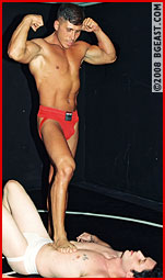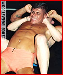 Rod's been bad-talkin' young punk Mike, so he challenges the musclehunk! Rod toys with the tattooed whiteboy, squeezing him in scissors. Feisty Mike tries nelsons, scissors, jackknife pins to no avail, but a well-aimed shot to the balls brings the hot hispanic stud down to a stripped jock. Jockstrap battle: double headscissors, butt and face humping, 2 bearhugs! Rod poses his phenomenal physique, forces Mike to strip him, clamps on a final nude bearhug. Rod shoots his big load over the loser's chest, and the young punk shoots his emission as Rod keeps posing that dark sexy musclebod.