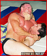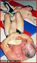 In a San Diego ring, big beefy Sam wants Dave to show him the ropes. The barefoot rookie outweighs the muscled vet. Dave breaks in the newcomer with armbars, neckcranks, leglocks. He even lets Sam have some, like a cat playing with its prey. Sam's new but he can take it. Dave gets a bloody nose & punishes Sam with a humiliating pin/submission finish.
